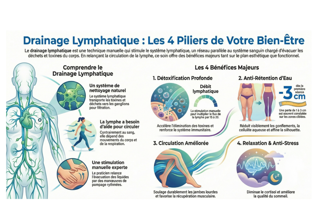Le drainage lymphatique agit comme un véritable « reset » métabolique. En accélérant le flux lymphatique, on permet :
